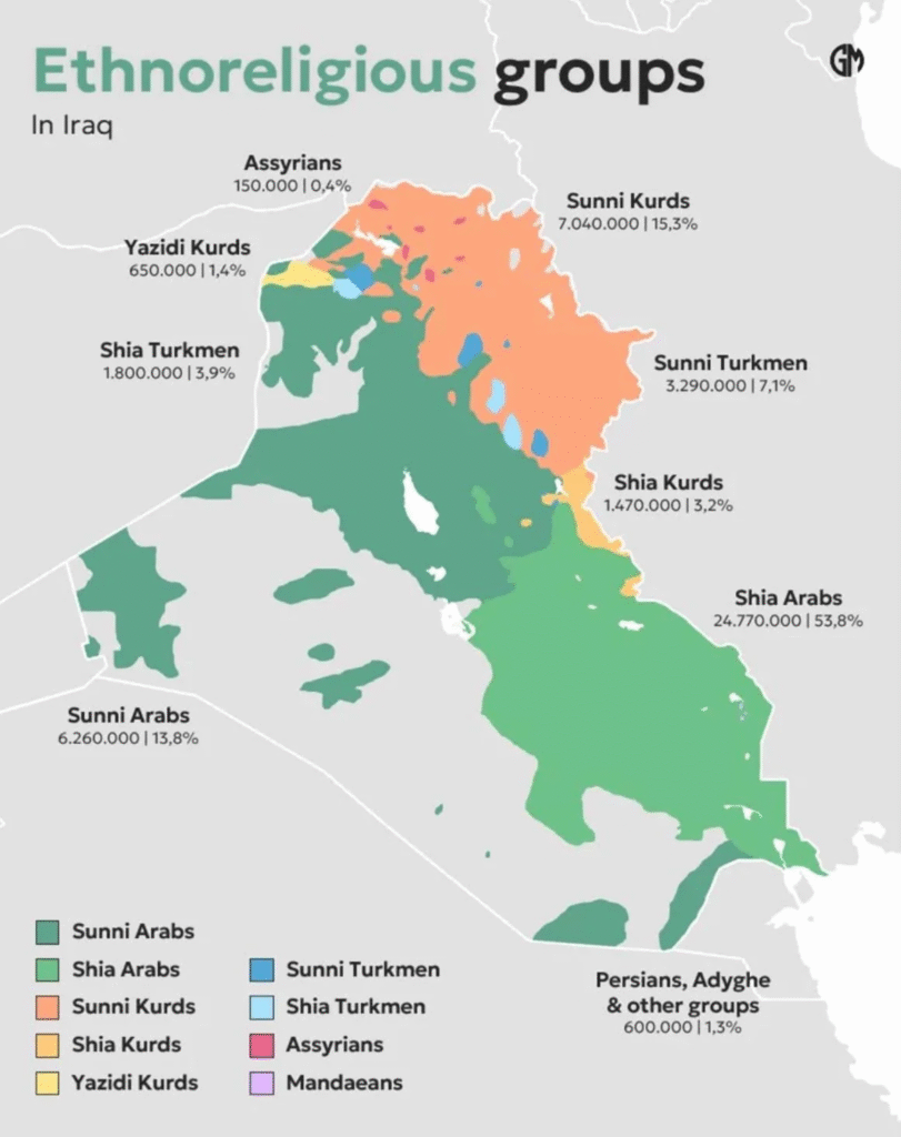 Iraq’s modern history has been shaped by intense struggles over identity, power, and belonging. Sectarian and ethnic tensions, intensified by decades of authoritarian rule, wars, and foreign interventions, have left lasting marks on the country’s social and political fabric. Sunni Arabs, Shi’a Arabs, and Kurds form the largest demographic groups, while many other indigenous ethno-religious communities, including Assyrians, Chaldeans, Syriacs, Armenians, Yazidis, and others, have historically had limited political representation. This marginalization has been a major driver of emigration and displacement, a process that continues to affect communities today.