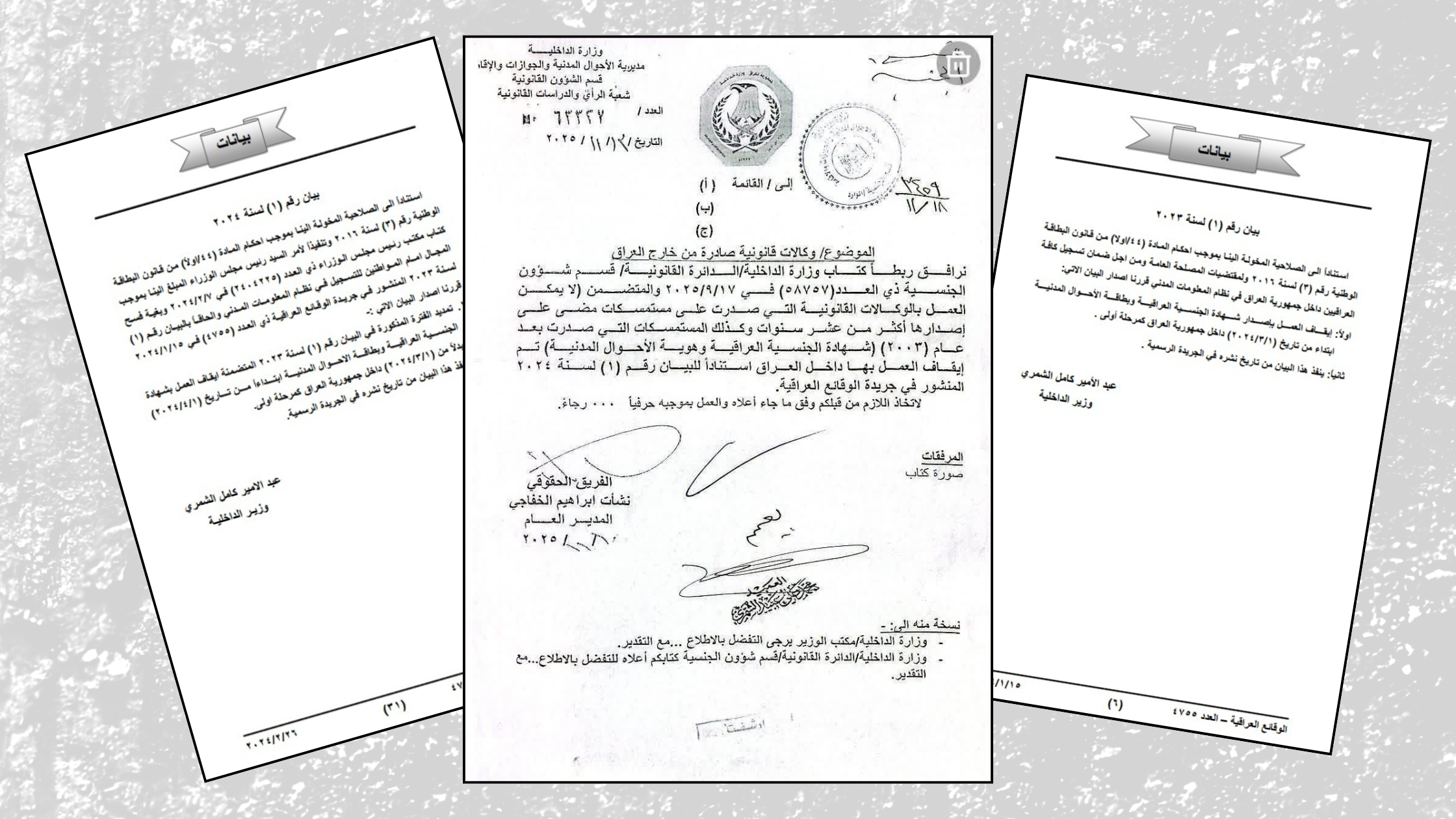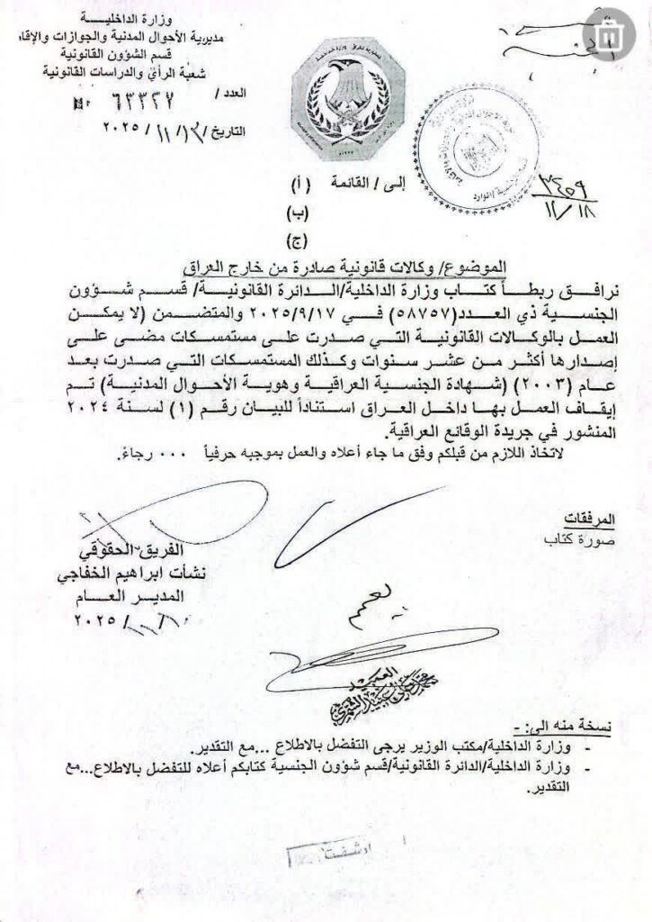 The covering letter itself is dated 13 November 2025 (Issue No. 63327), and its circulation in media outlets contributed to wider public attention, particularly among Iraqis living abroad who rely on consular powers of attorney.