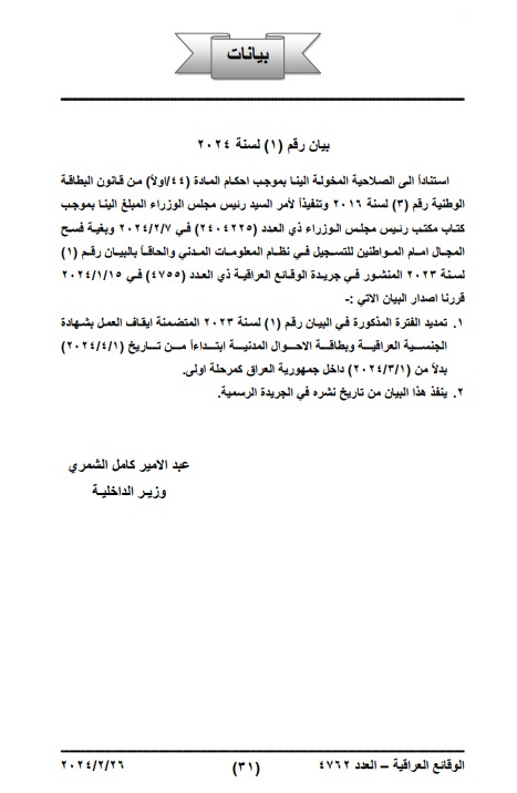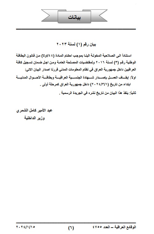 Under Statement No. (1) of 2023 by the Ministry of Interior, Gazette Issue (4755), published on 15 January 2024, Iraqi authorities announced that: